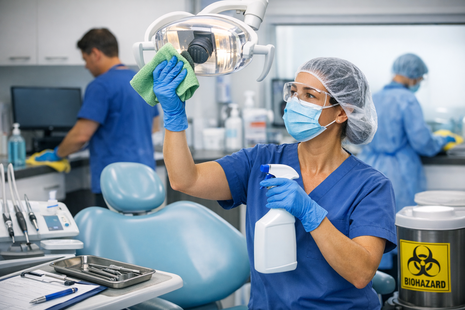 Dental operatories require extra care. Bloodborne pathogens and aerosolized particles are common in dental procedures. Cleaning must follow healthcare-grade protocols.